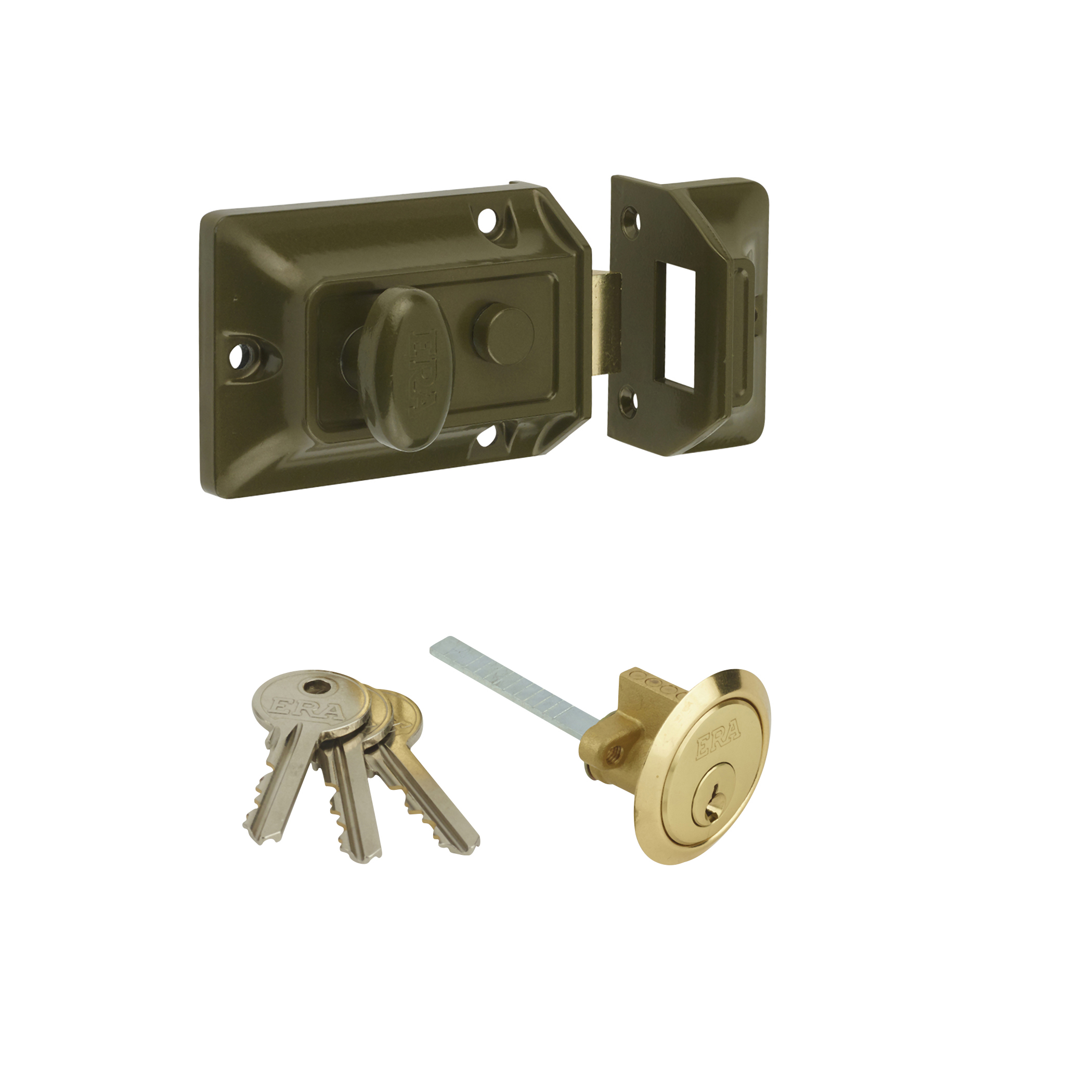 Suitable for timber doors, the Traditional Nightlatch is available in a range of finishes includes traditional green, brass effect and chrome effect. The external rim cylinder is available in brass, satin and chrome finishes and is supplied with 3 cut keys to operate the nightlatch.