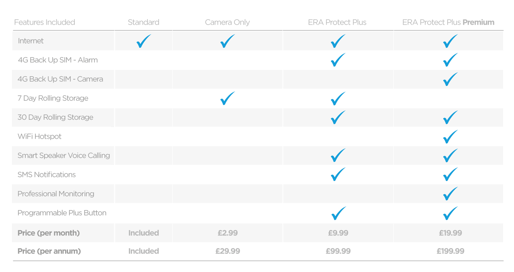 An ERA Protect Plus subscription can be added at any time. For cameras, Protect Plus enables all cameras on that account to be covered. The cameras will record and upload video on motion detection and clips are stored on a rolling 30 days basis. If you have 4 or more cameras, then a Protect Plus subscription offers better value for money rather than the single camera 7 day plan. See above for details of the Protect Plus subscription plans.