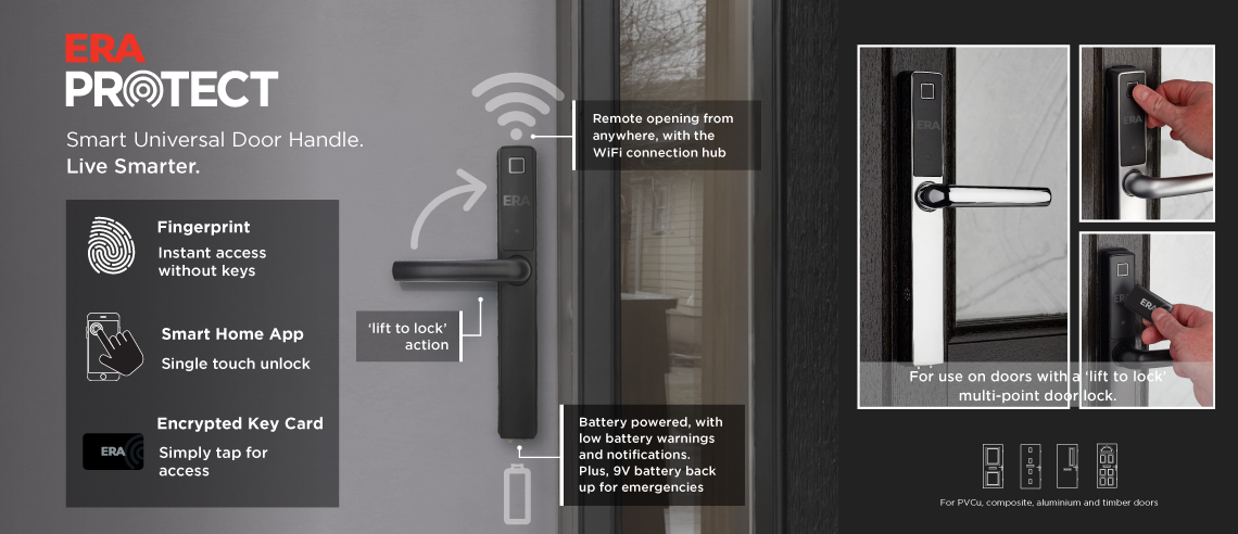For use with multi-point door locks with a ‘lift to lock’ action, the ERA Protect Smart Universal handle can be fitted to any new or existing, PVCu, composite, aluminium or timber door. The handle is battery powered and all wiring is contained in the handle, no need for an electrician!
