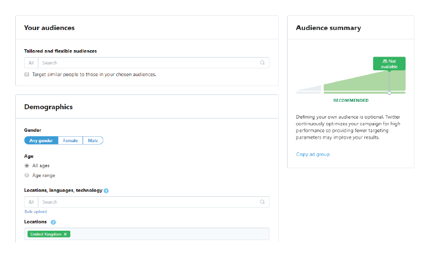 Think about what you want to gain from your ad. A good objective to begin with would be ‘Tweet Engagements’. When choosing your target audience you need to know who you are trying to sell to. For example, you are a locksmith trying to sell your services so you wouldn’t target audiences that interests are ‘locksmith’ as more than likely thats their job too. Instead, target people interested in home improvements or renovation. You could be more specific and target an age range or mums as they’re more likely to want increased security and need someone to fit it.